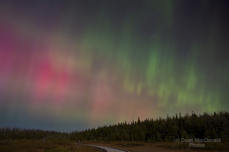 This image captures the aurora borealis over Oliphant Fen on the Bruce Peninsula in Ontario, Canada.