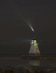 This image shows a wider field of Comet Lemmon (C/2025 A6) setting above the Southampton Range Lighthouse on October 26, 2025. Discovered in January ...[+]